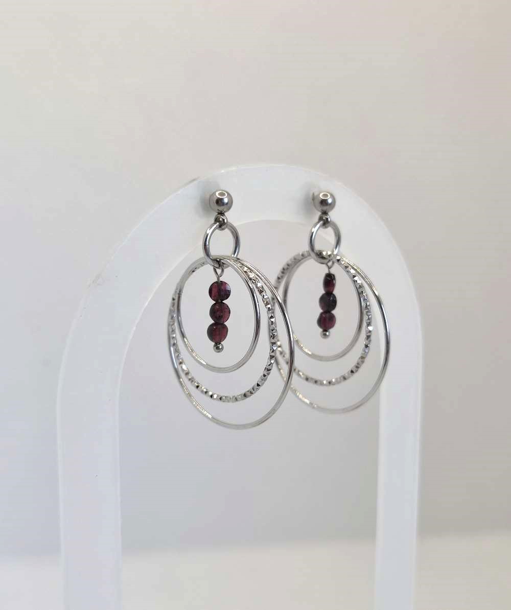 Les boucles d’oreilles grenat argenté évoquent la puissance du feu intérieur. Cette énergie vive qui nourrit la motivation, la créativité et l’envie de passer à l’action. Elles symbolisent la femme qui se fait confiance et qui ose exprimer pleinement son potentiel.