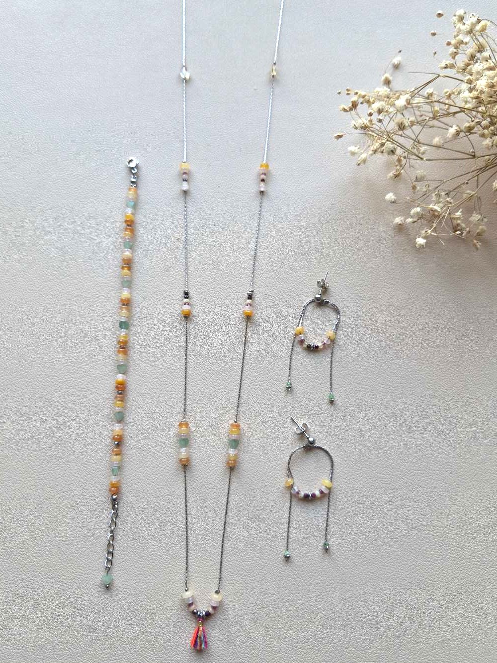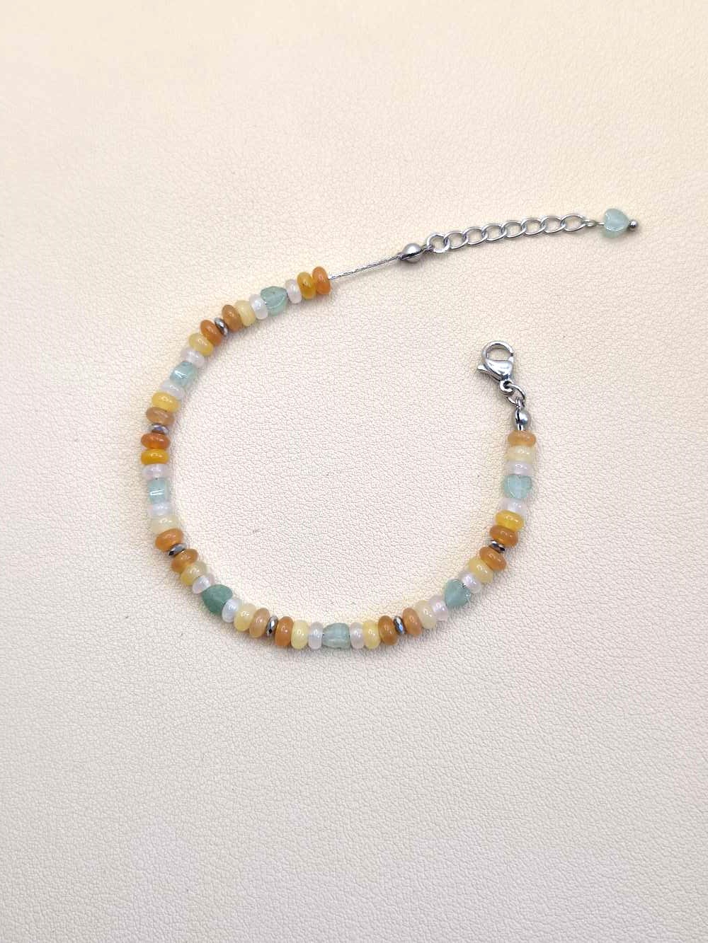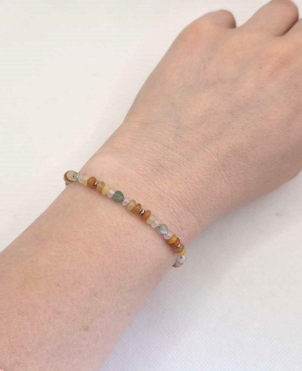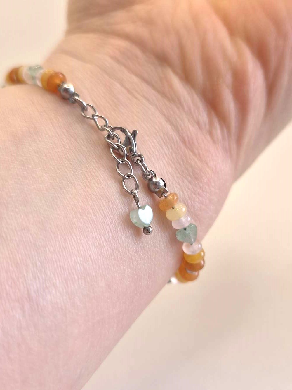 Ce bracelet réunit de délicates pierres d’aventurine aux teintes vertes, jaunes et orangées, accompagnées de quartz rose. Ensemble, elles évoquent un jardin lumineux où la vie circule avec harmonie.