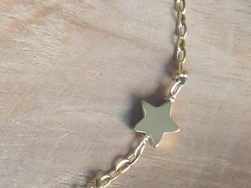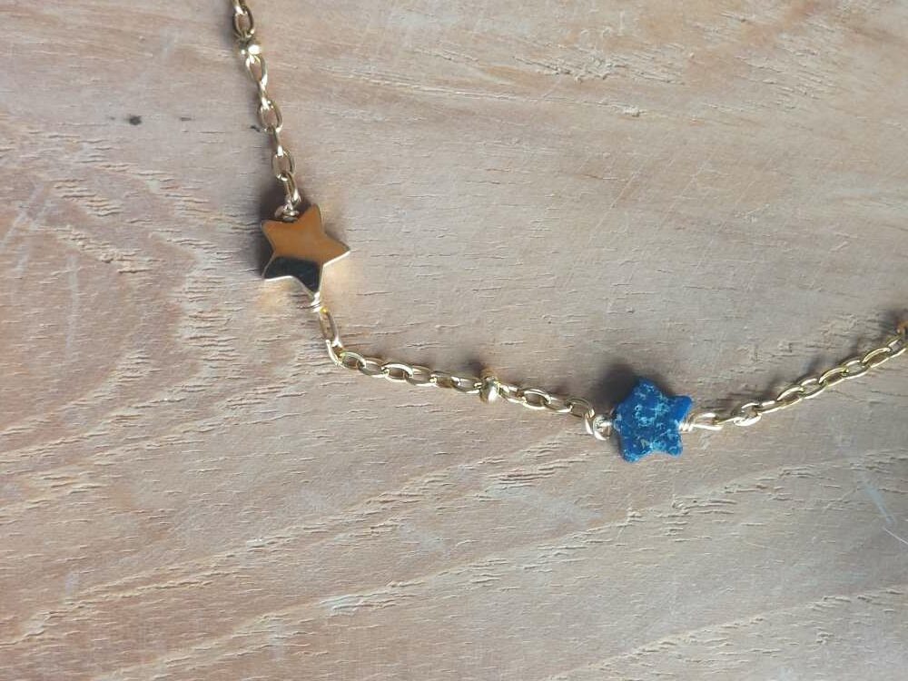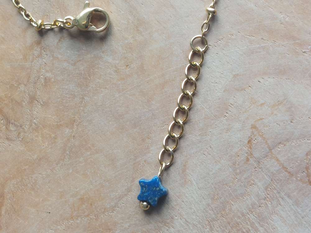 Sur une chaine perlé se trouve des étoiles doré et des étoiles en lapis lazuli,