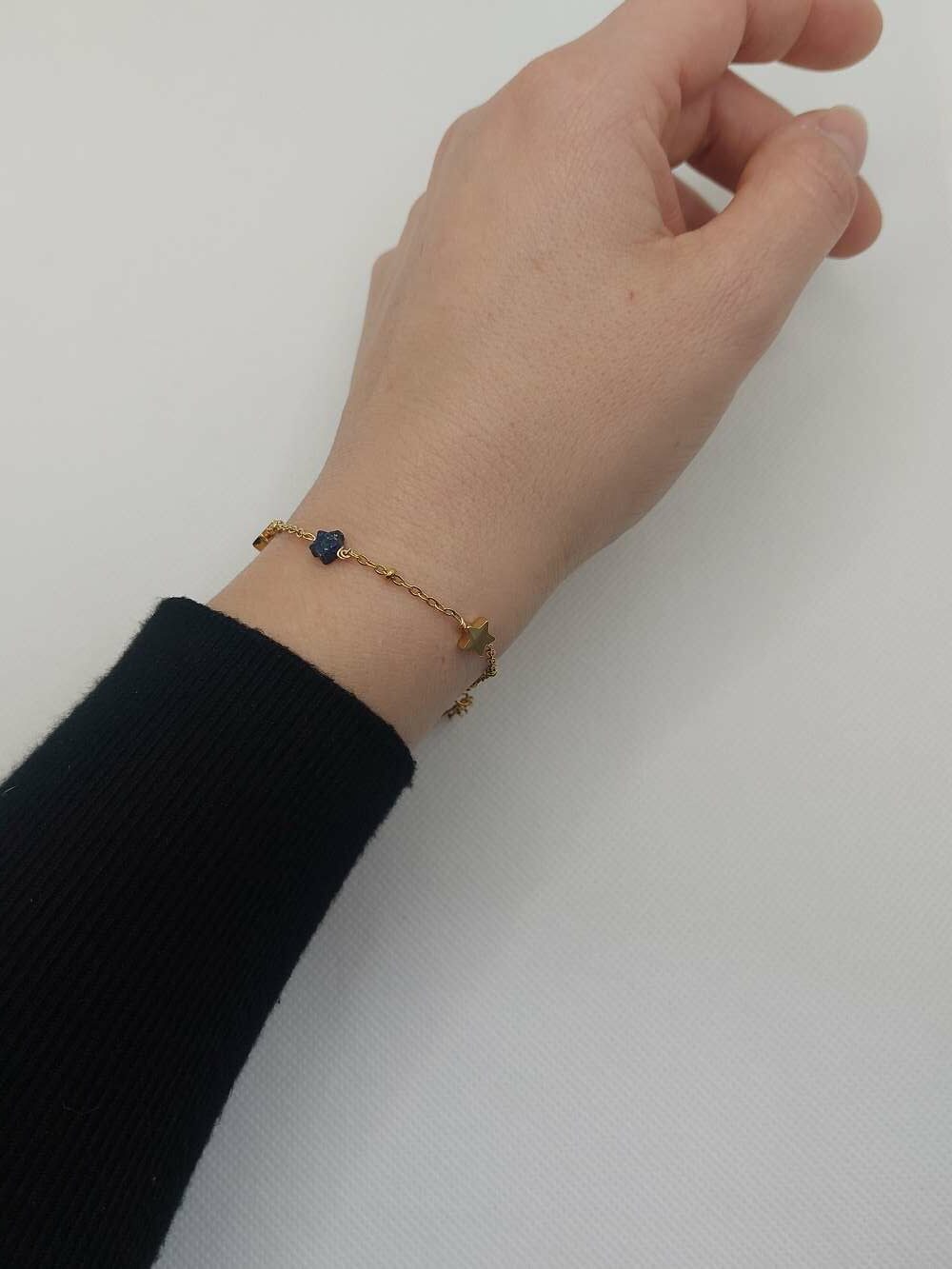 Le bracelet lapis lazuli est une invitation à écouter le langage silencieux de l’âme. Il réunit des étoiles en lapis lazuli et des étoiles dorée, comme deux éclats complémentaires. L’un reflète la profondeur du ciel nocturne, l’autre la lumière dorée de la destinée. Ensemble, ils créent une harmonie subtile.