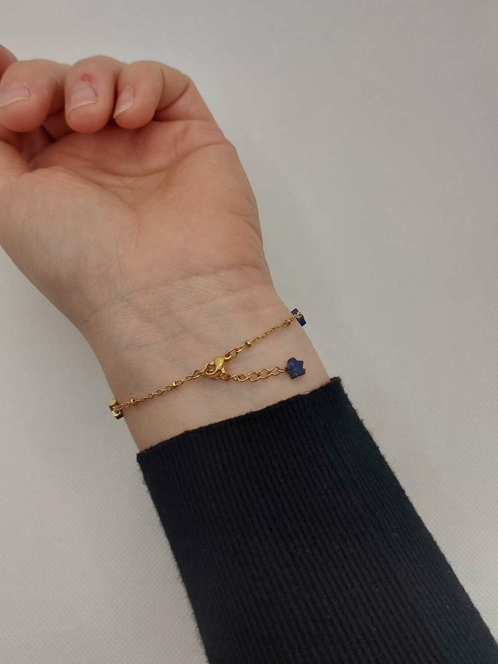 Au dos du poignet, la chaine d’ajustement se termine par une étoile lapis lazuli.