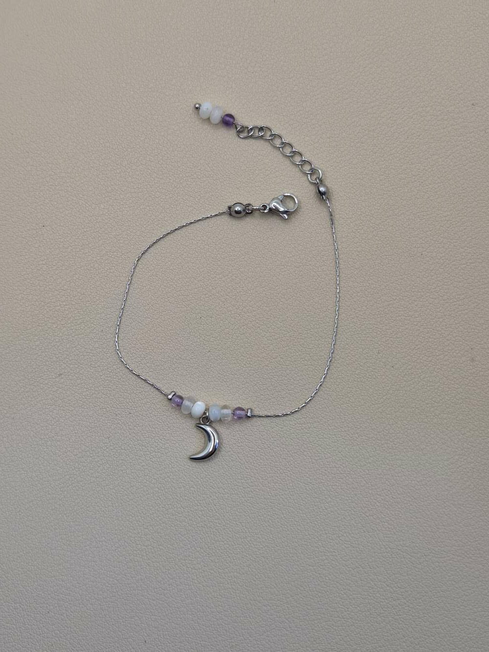 Ce bracelet lune et améthyste (argenté) s’adresse à la femme en quête de sens et d’équilibre. Et il permet de vous aider à accepter les cycles lunaires jouant sur toutes les femmes. La lune est relié à la femme.