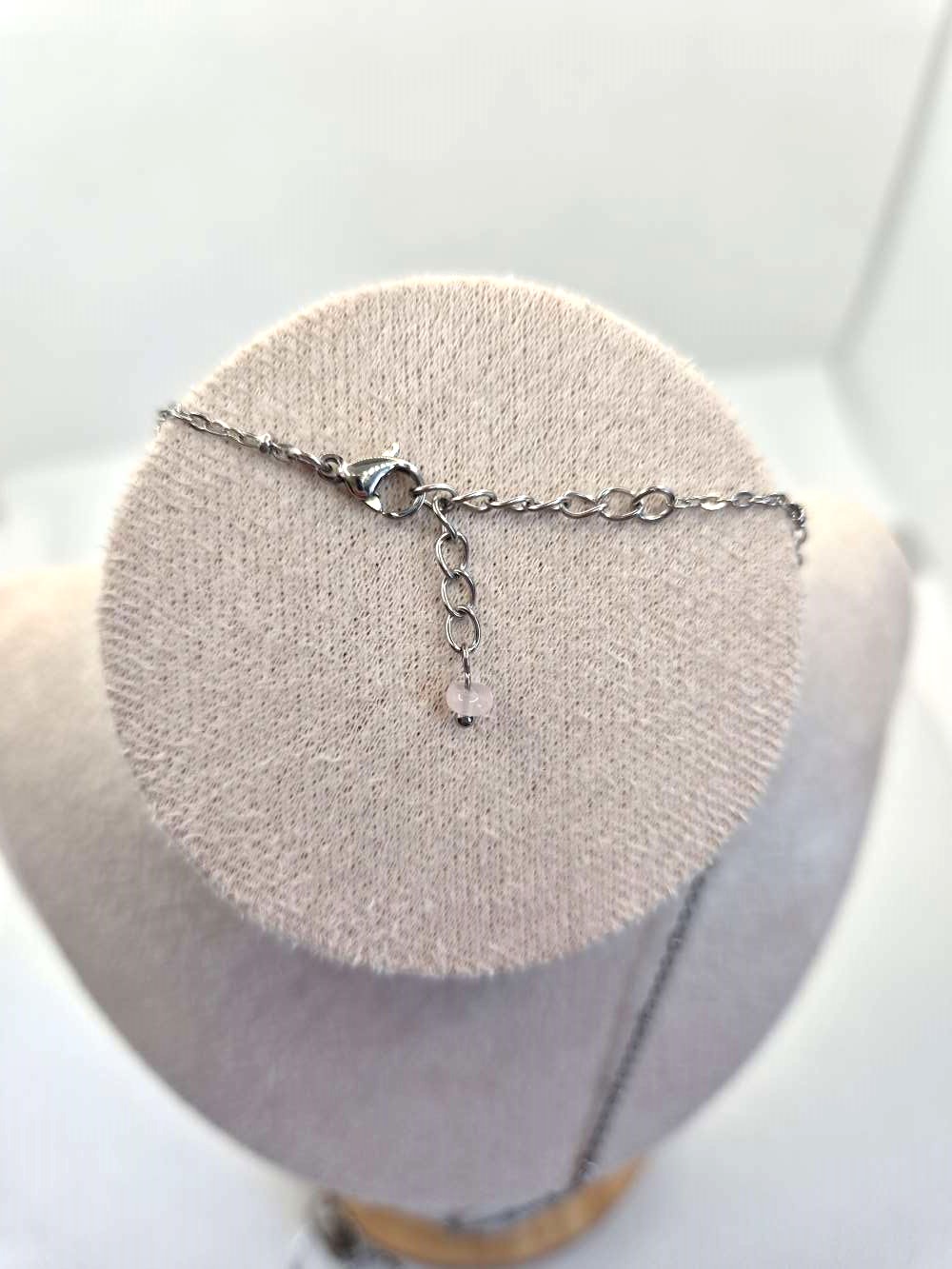 Un cercle rond aplatie puis une perle de quartz rose,