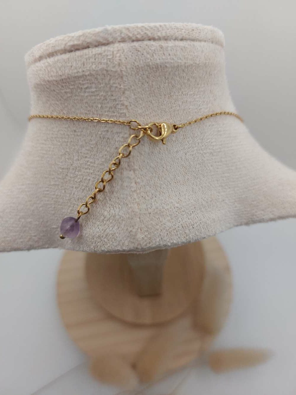 Dans la nuque, la chaine d’ajustement se termine par une perles de fluorite.