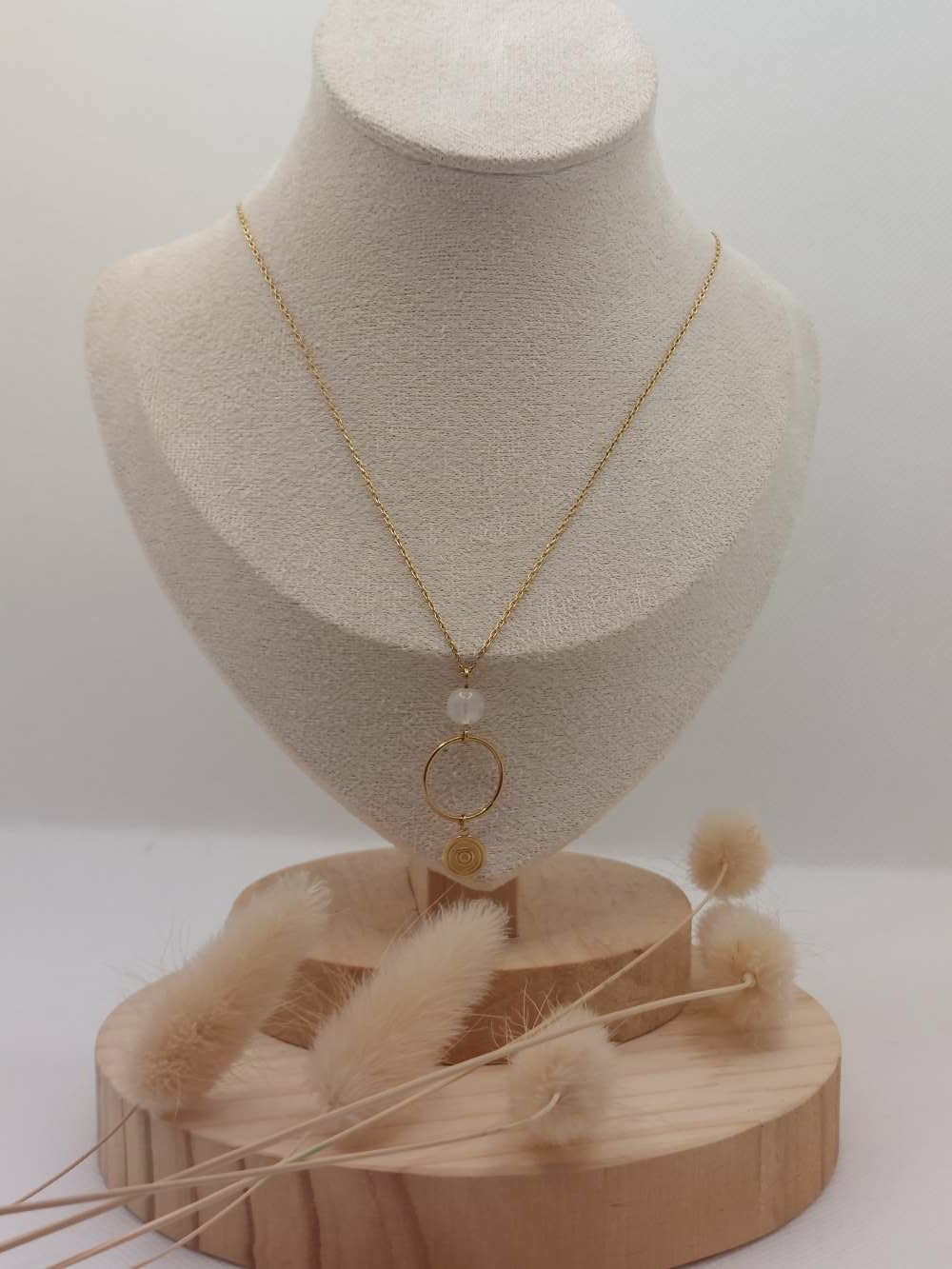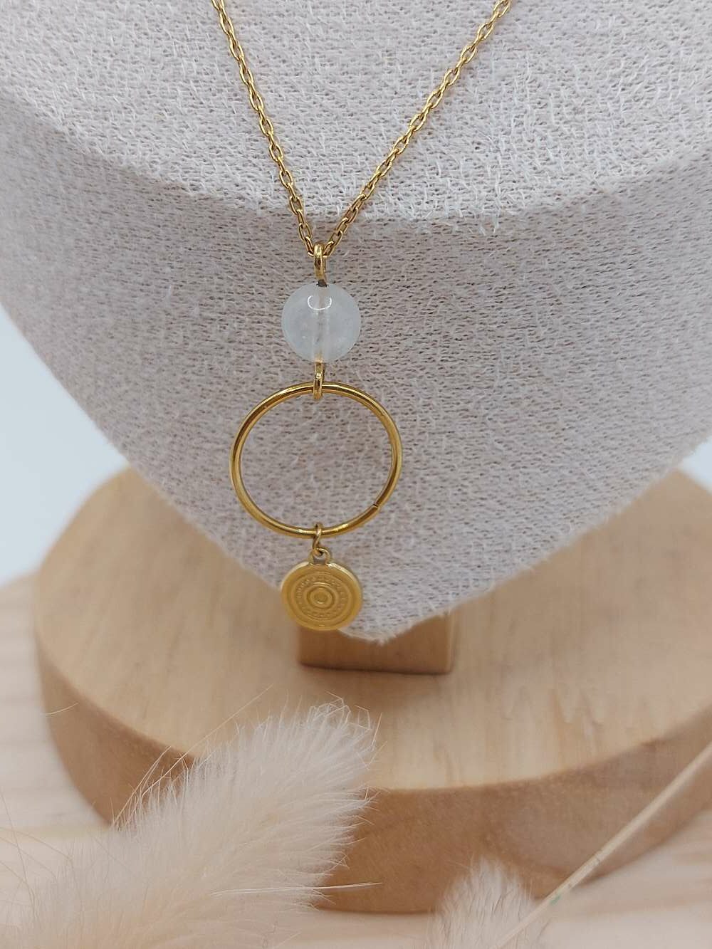 Au centre, une pierre de lune s’illumine. Elle capte les reflets et diffuse une clarté subtile. Associée à un cercle, elle symbolise le cycle éternel. Ensemble, ils créent un bijou qui inspire paix et équilibre.