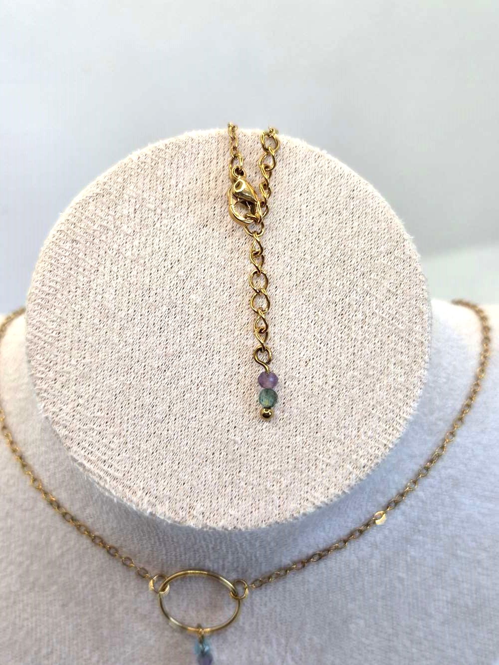 Le collier s’ajuste avec sa chaine de rallonge et se termine avec une perle d’améthyste et une perle de quartz vert.
