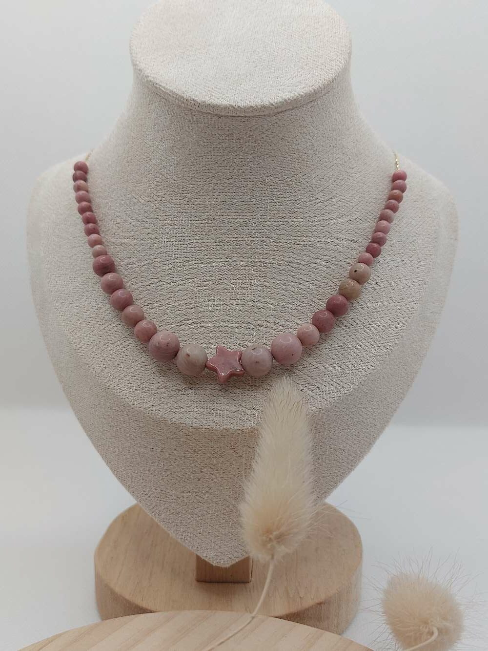 Découvrez le collier rhodonite de la collection Éveil de soi. Ce bijou fait main associe des perles rondes en rhodonite à une délicate perle étoile, symbole de guidance et de lumière. Il a été créé pour honorer vos émotions comme des messages sacrés et pour vous inviter à accueillir votre sensibilité comme une véritable force intérieure.