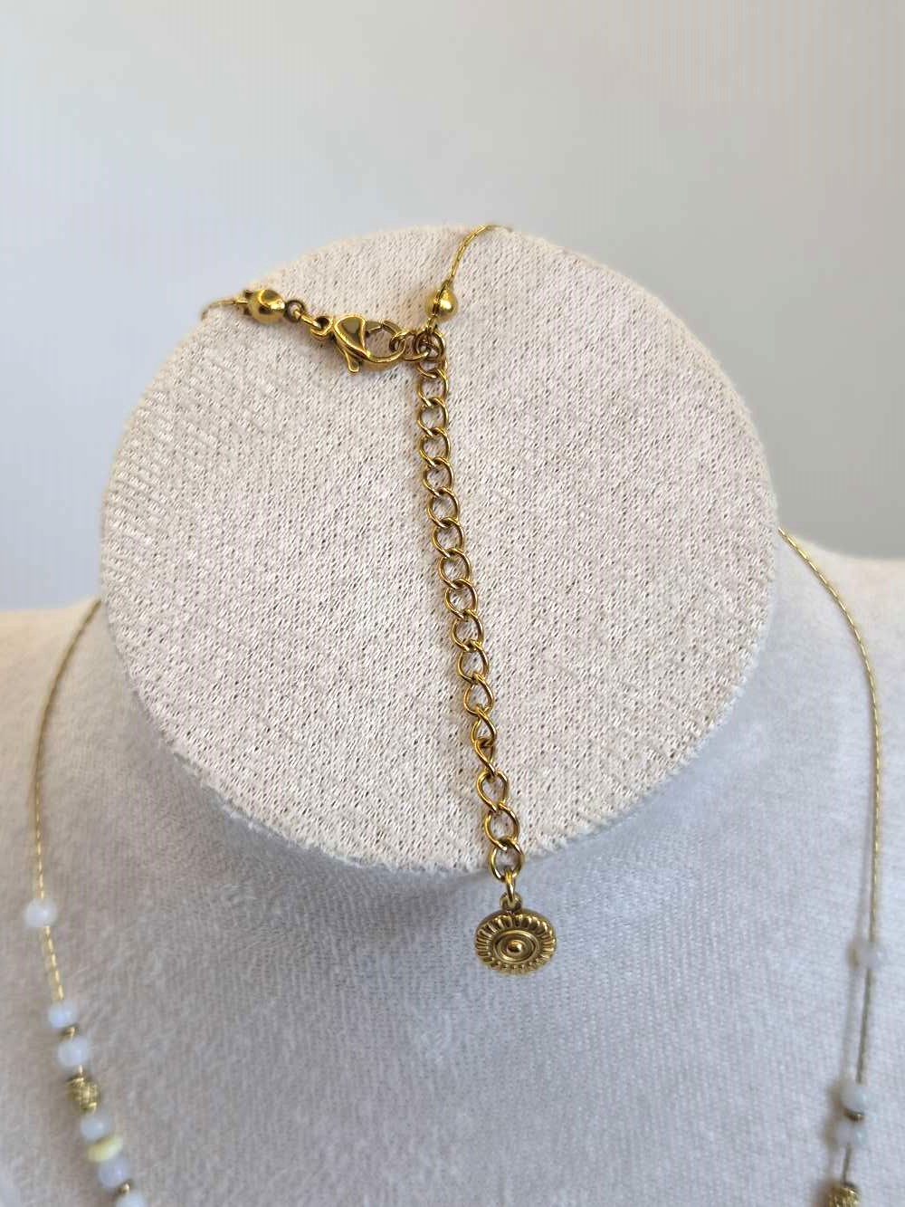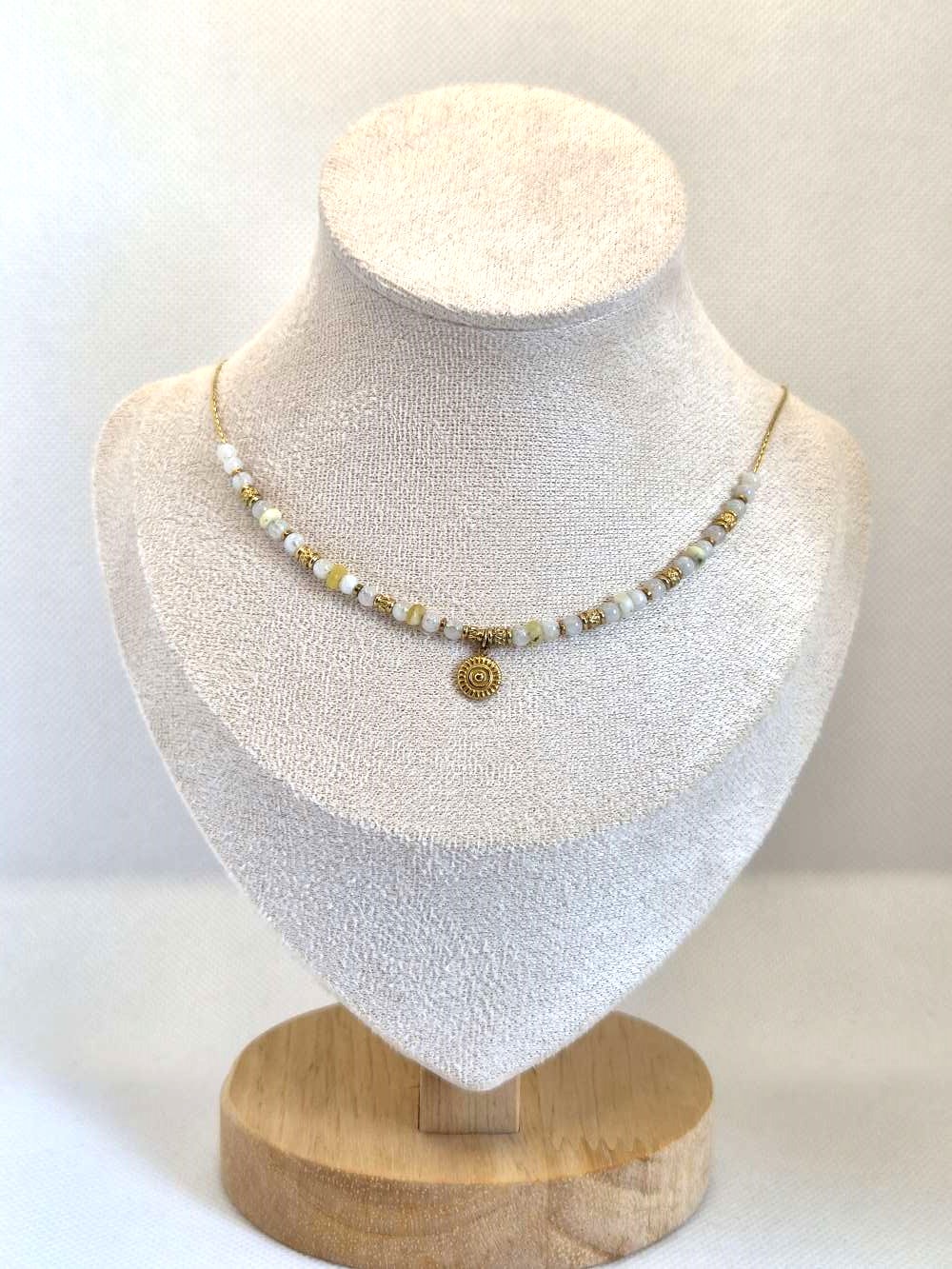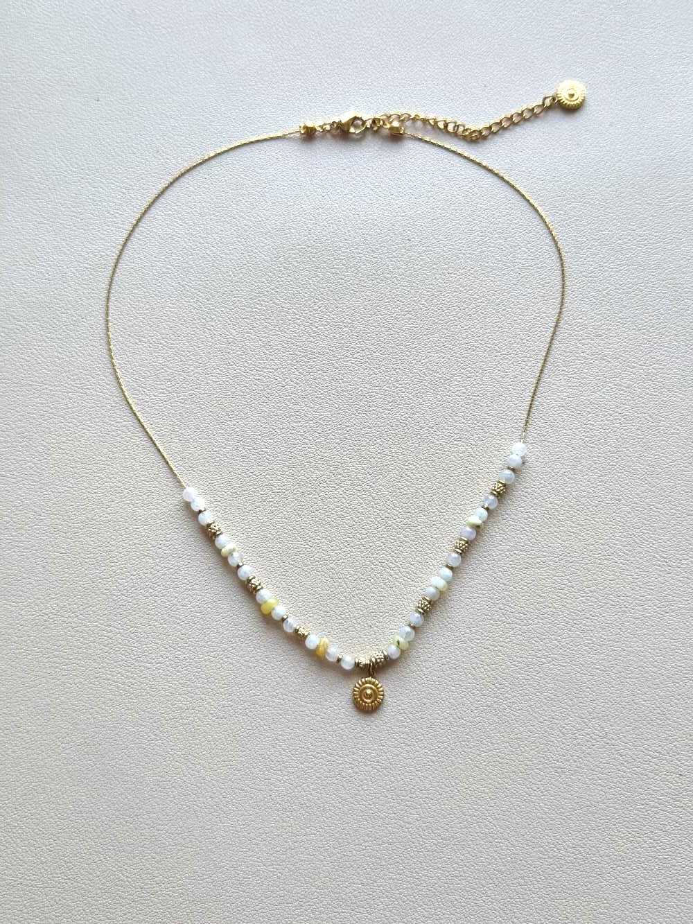 Réalisé en acier inoxydable doré, ce collier ras de cou met en valeur des pierres naturelles aux vertus puissantes. La pierre de lune favorise l’harmonie, développe l’intuition et apaise les émotions. Puis, l’opale jaune diffuse une énergie de guérison, soutient le bien-être et attire l’amour et la sécurité. Ainsi, ces pierres créent une synergie douce et protectrice.
