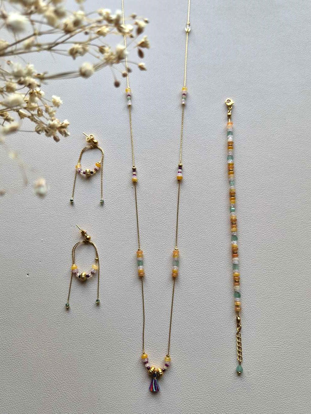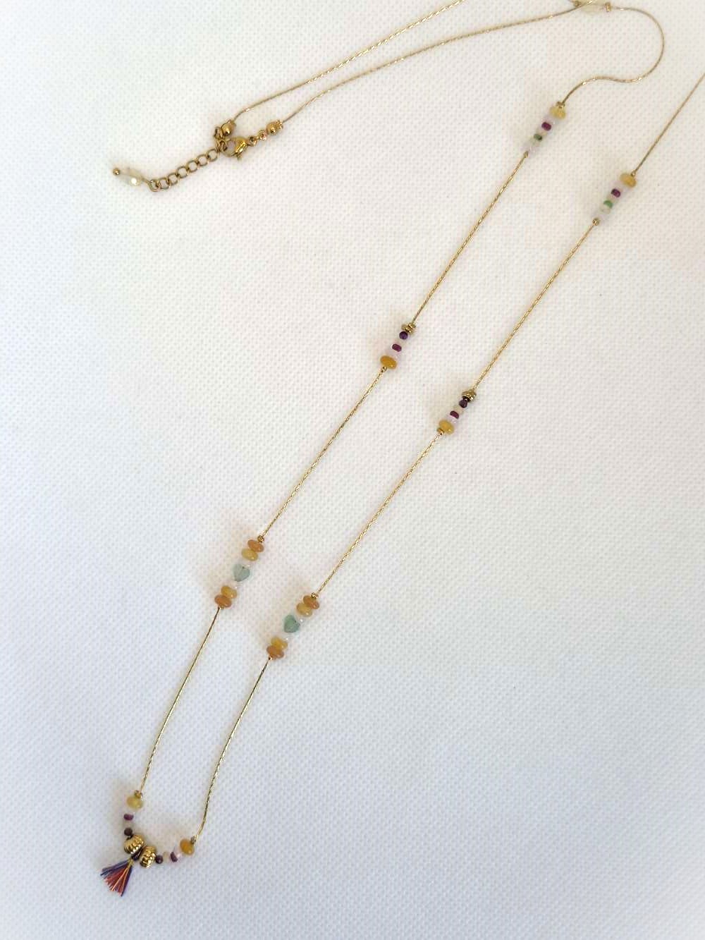 Avec ses pierres aux couleurs vibrantes et lumineuses, ce sautoir évoque un jardin vivant, rempli d’énergie, de douceur et de vitalité.